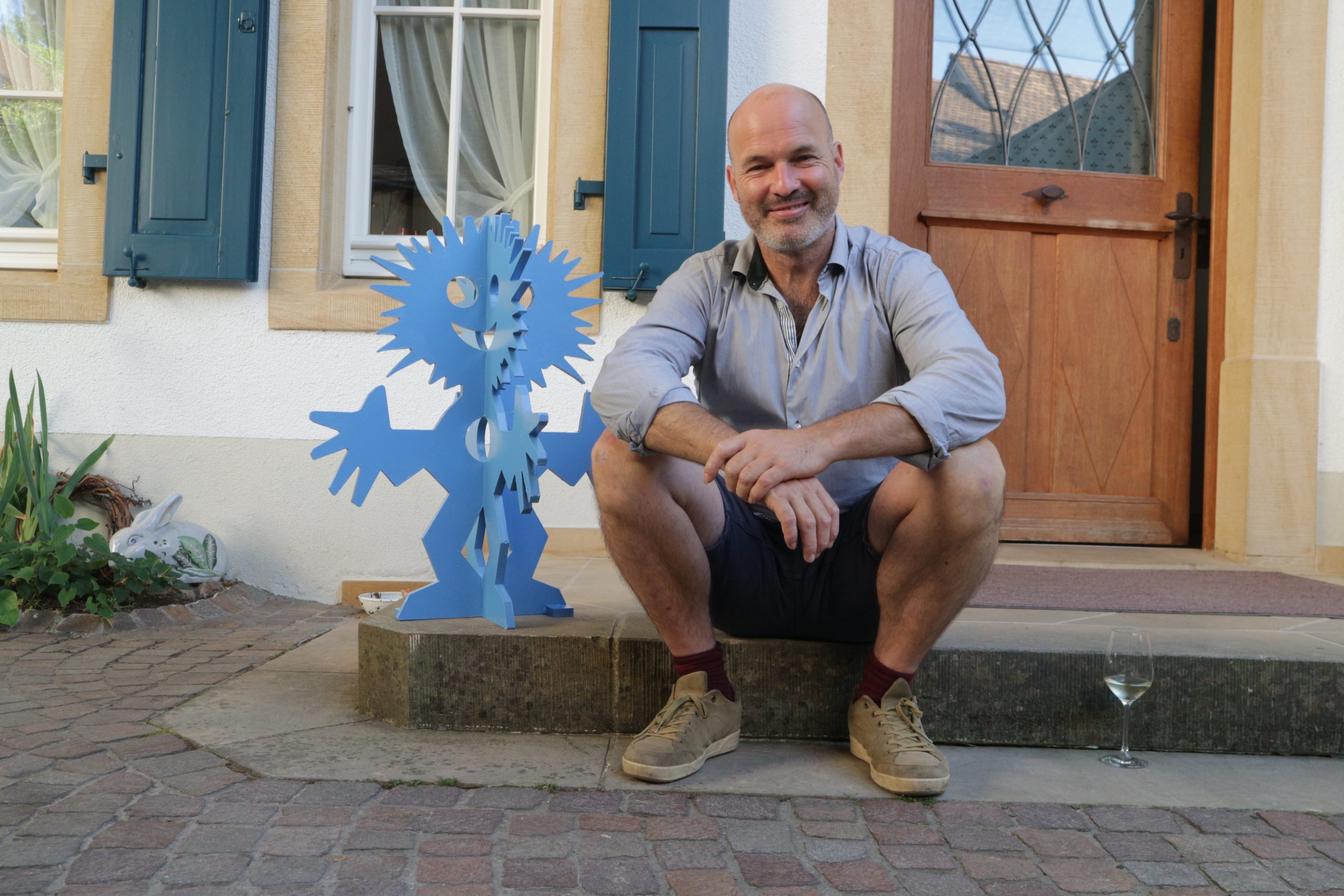 Marco Schuler mit einer Stahlskulptur im Weingut Lämmlin-Schindler in Mauchen,